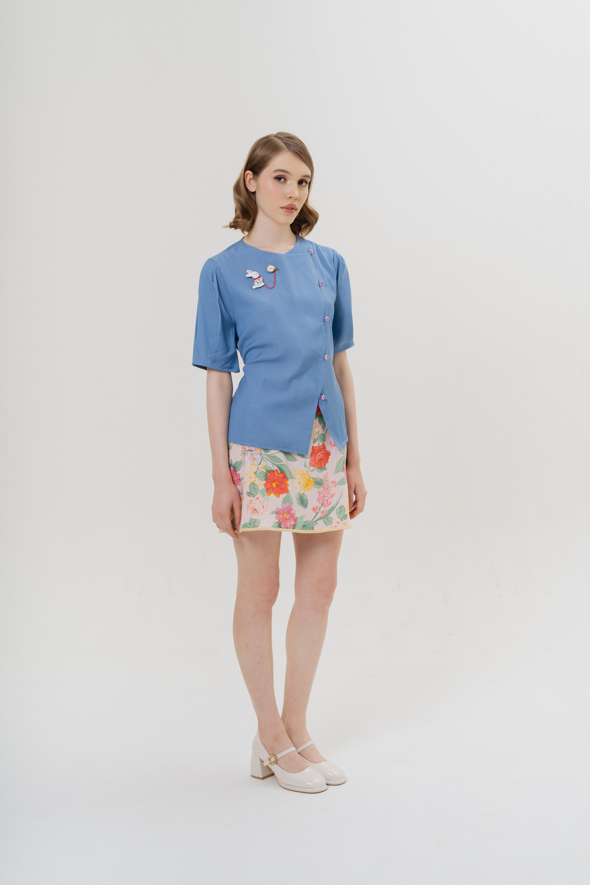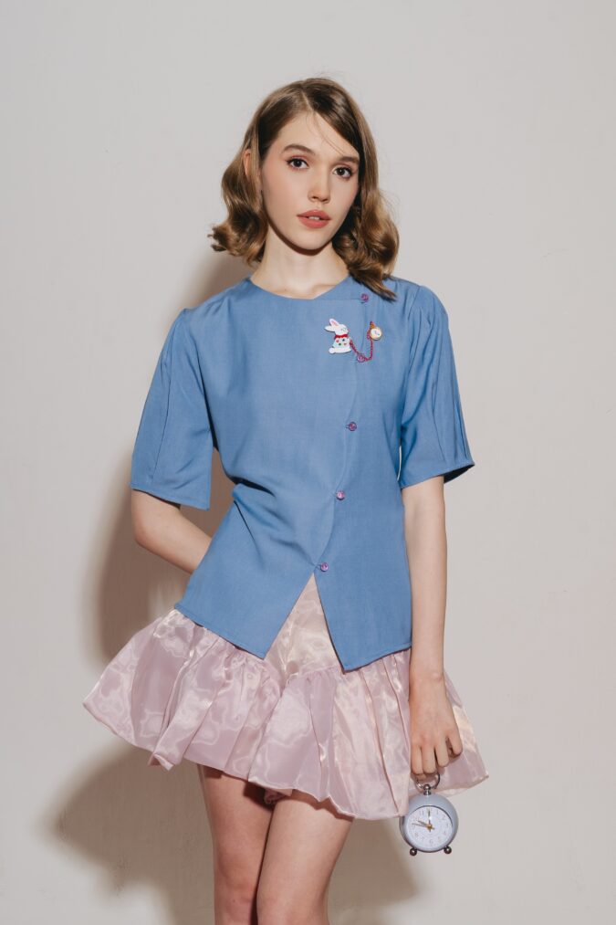 Coney Top in Blue with White Rabbit & Clock Magnetic Brooch