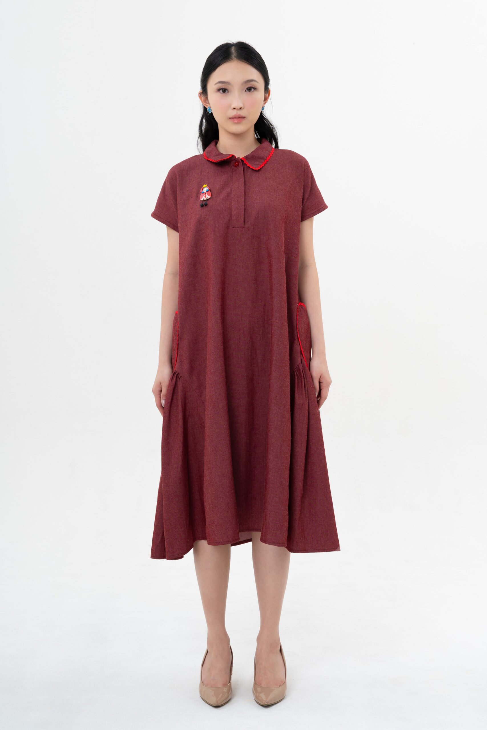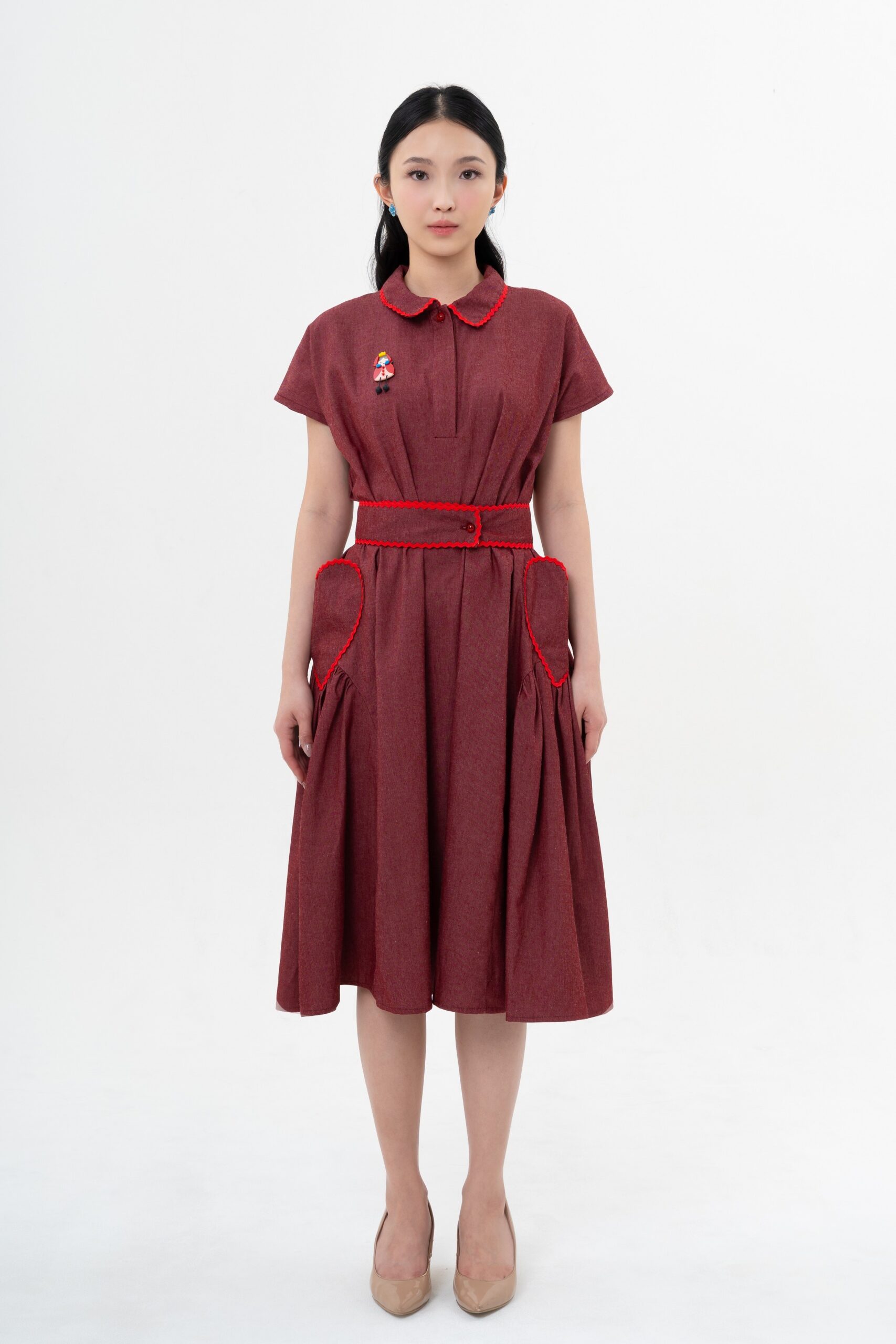 Cora Dress in Brick Red with Queen of Hearts Magnetic Brooch