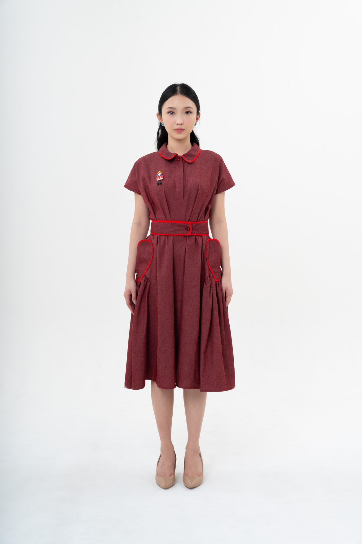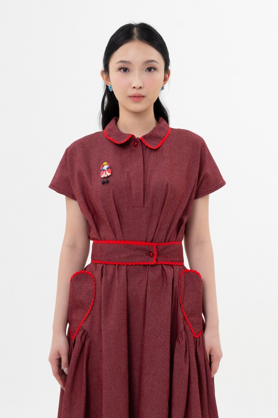 FREE SIZEIntroducing a new color in the best selling Cora Dress, in Red! Its color is both luxurious and deep, making your skin tone brighter. Featuring a detachable belt for versatile styling and enchanting Queen of Hearts magnetic brooch, its bright red lining accents add a striking touch of confidence to your important days.