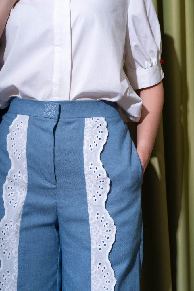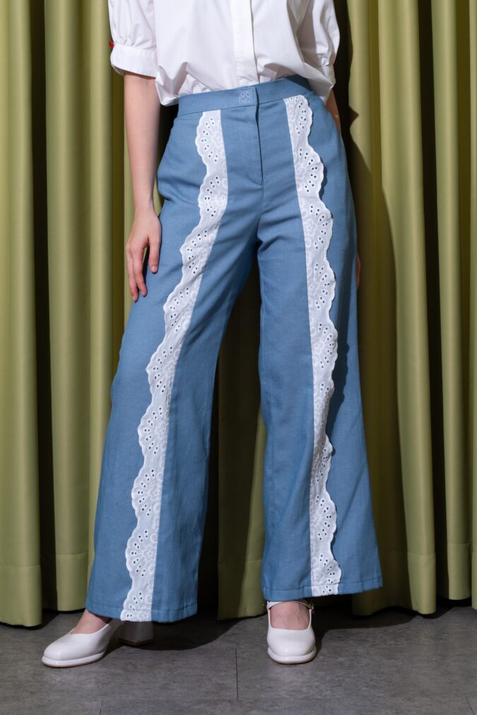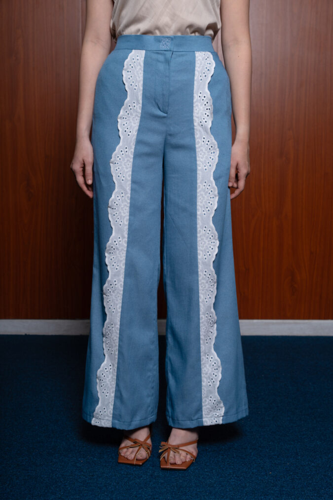 FREE SIZEDesigned from soft, structured denim, Vio Pants feature a high-waist cut with wide-leg silhouette and delicate lace panel detailing for a feminine twist. The tailored fit elongates the legs while providing comfort and flexibility. A statement essential, these pants effortlessly blend classic denim with romantic charm.